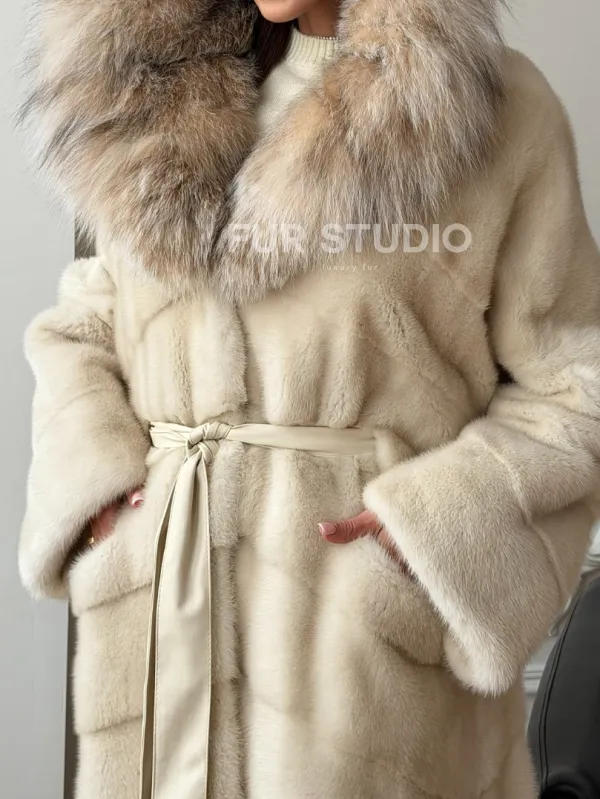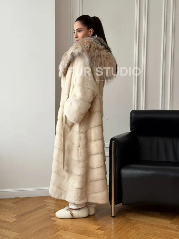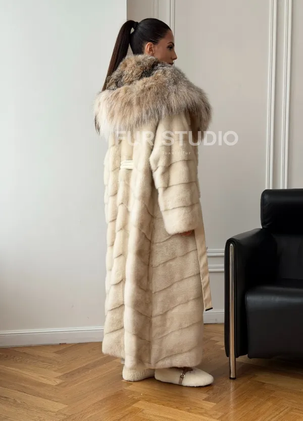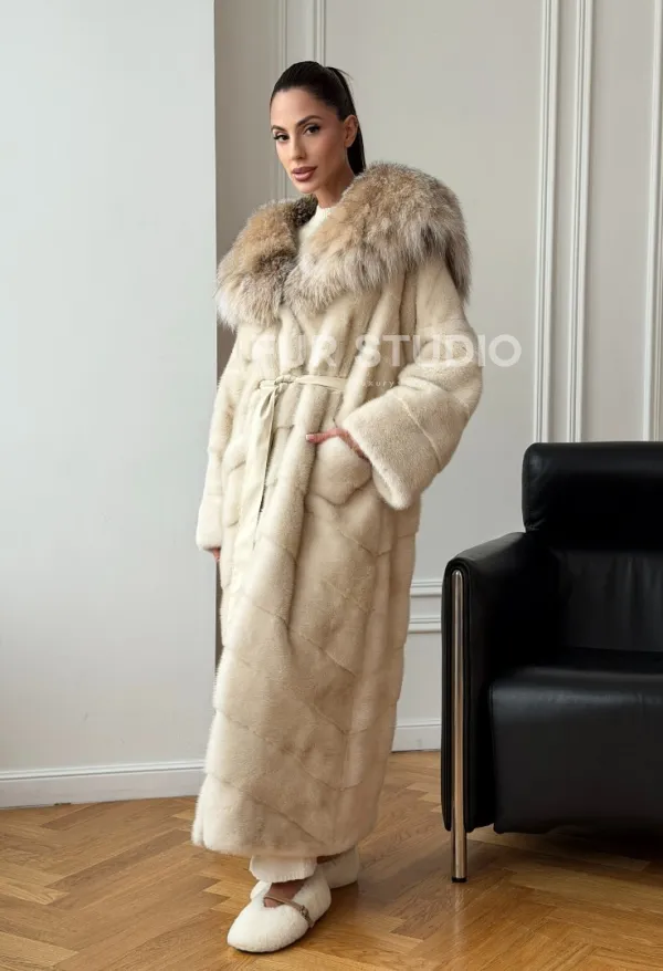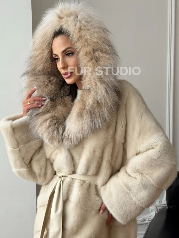 Длинная норковая шуба - капюшон из меха рыси 102713