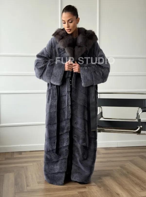 Мех данной шубы аукционная норка, цвет серый. Предлагается в размерах от 42 до 48. Длина модели 140-145 см, что выгодно подчеркивает фигуру девушек. Эта модель идеально подойдет для девушек и женщин, предпочитающих роскошные натуральные меха.