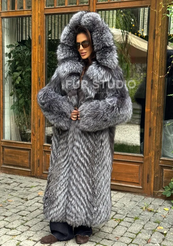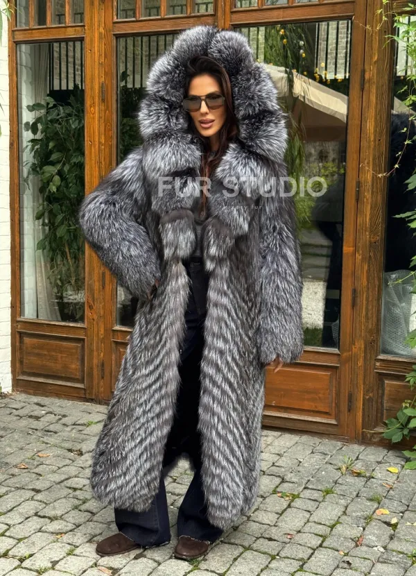 Мех данной шубы лиса, цвет серый. Предлагается в размерах от 42 до 52. Длина модели 125-130 см, что выгодно подчеркивает фигуру девушек. Эта модель идеально подойдет для девушек и женщин, предпочитающих роскошные натуральные меха.