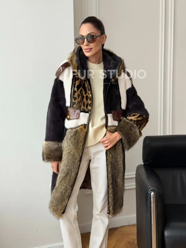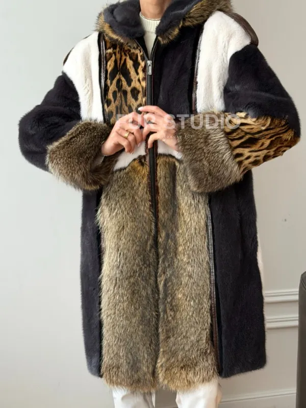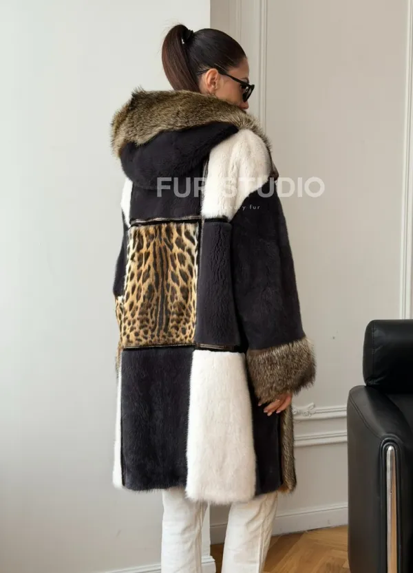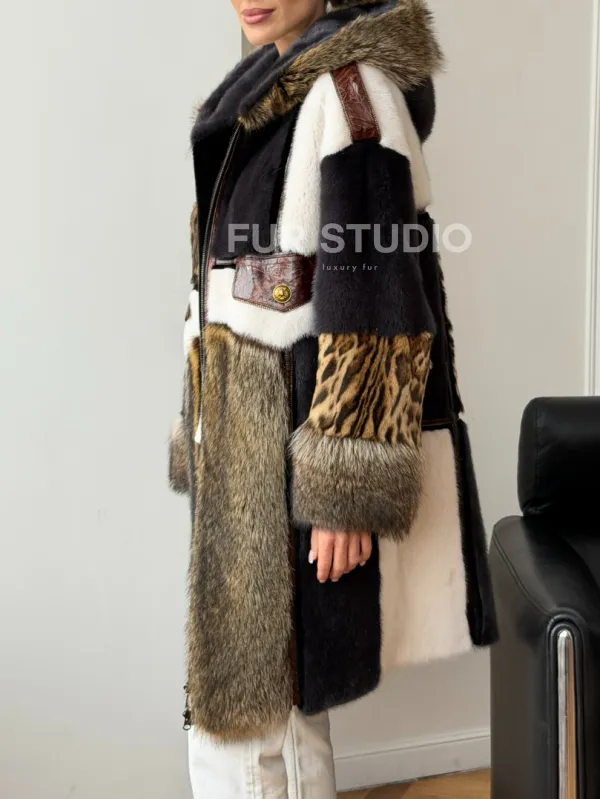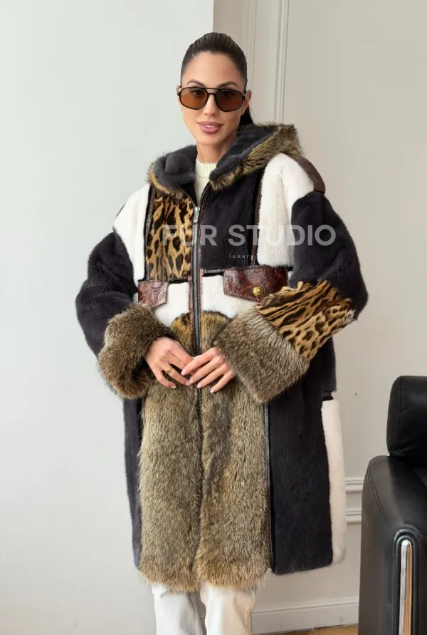 Комбинированная норковая шуба с капюшоном доступна для покупки в нашем шоуруме Furs Studio в . У нас так же есть доставка во все города России. Добавьте немного роскоши в свой гардероб с этой шубой, которая будет служить вам многие годы.