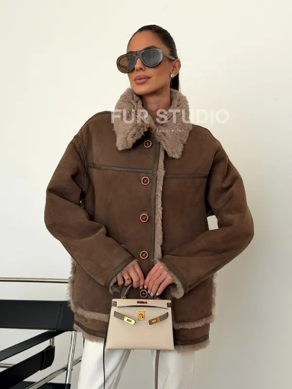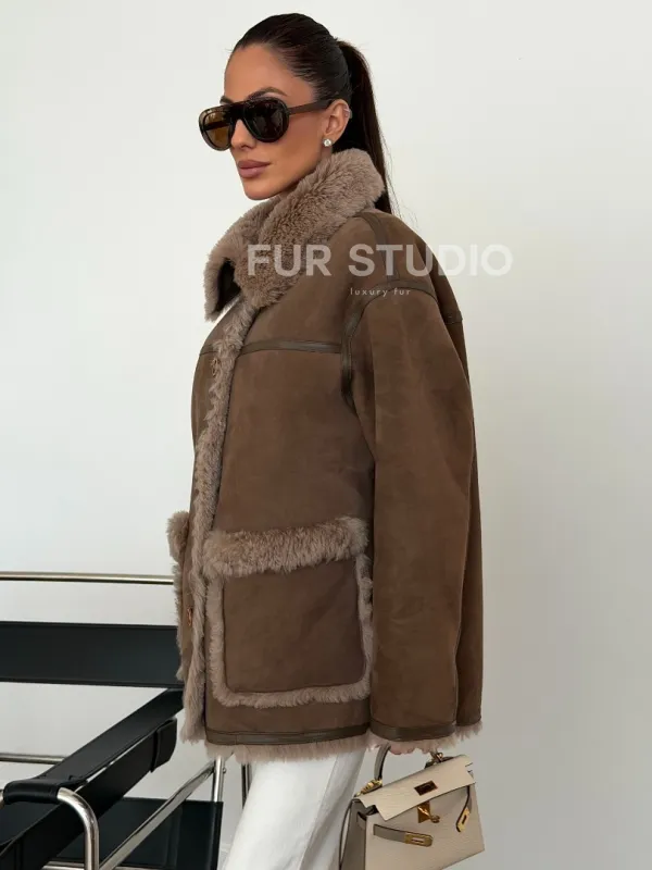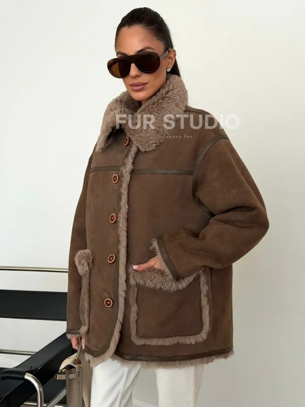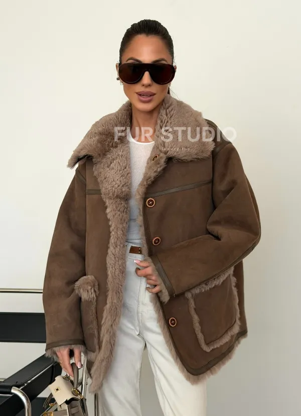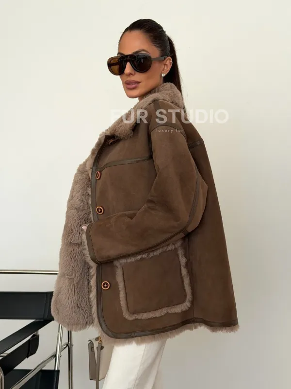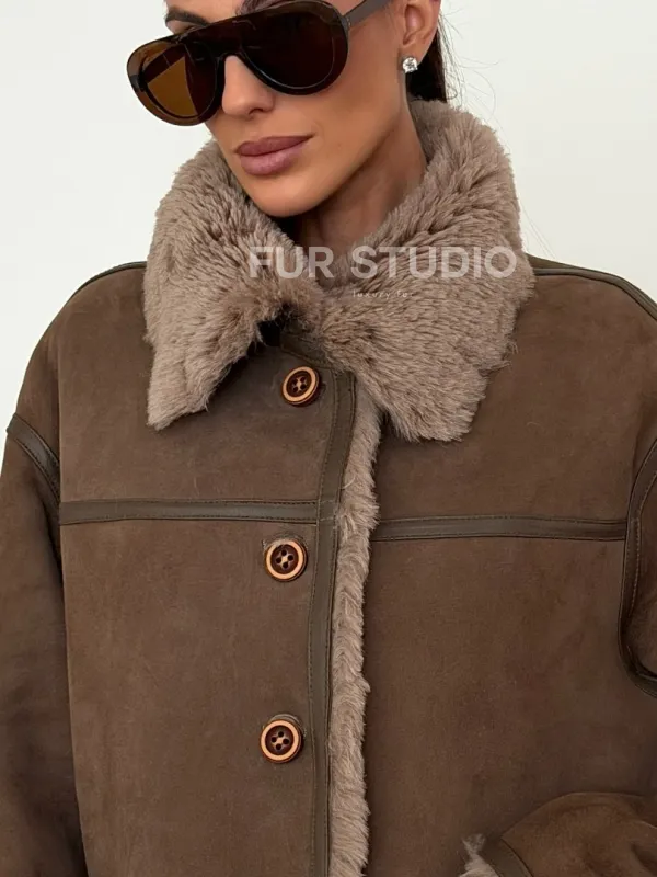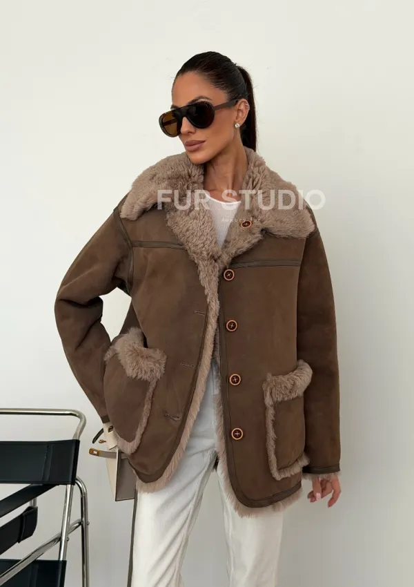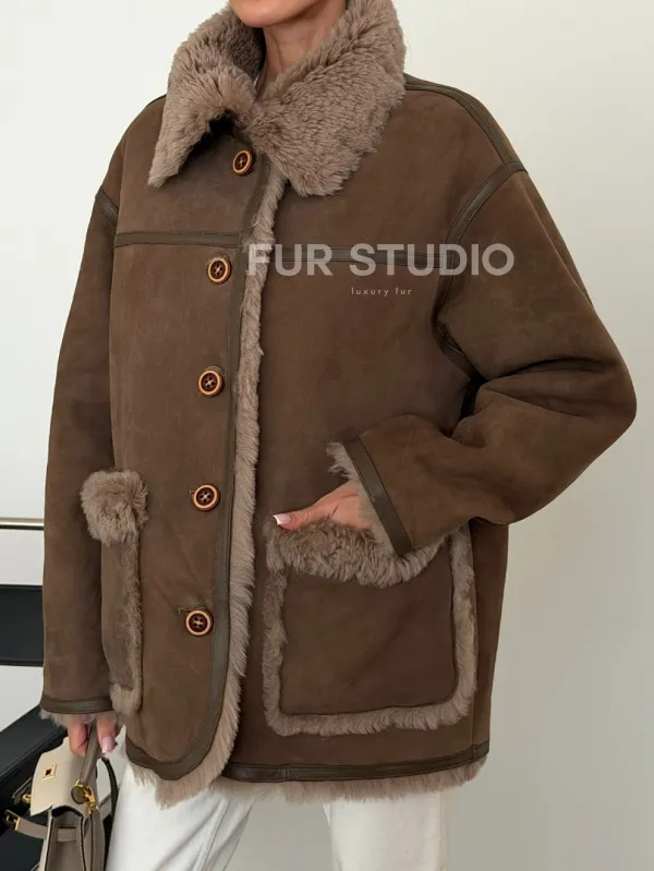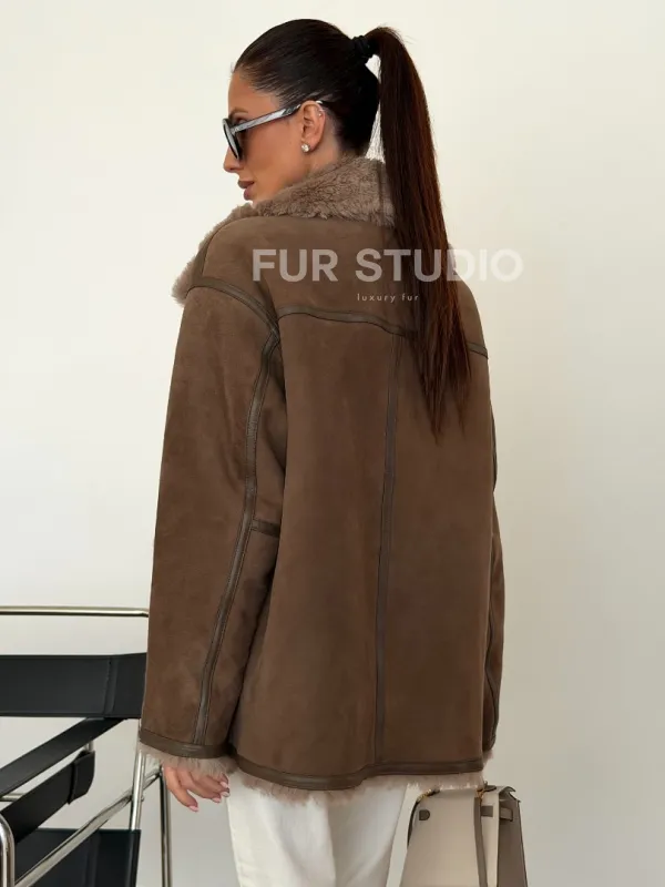 Коричневая замшевая дубленка на мехе тиградо 102628
