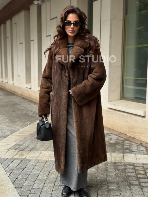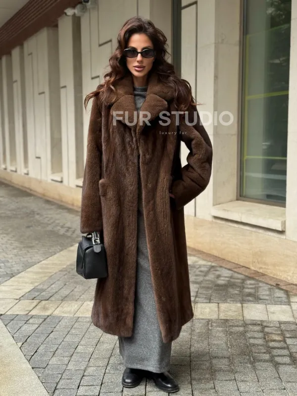 Мех данной шубы аукционная норка, цвет коричневый. Предлагается в размерах от 42 до 52. Длина модели 115-120 см, что выгодно подчеркивает фигуру девушек. Эта модель идеально подойдет для девушек и женщин, предпочитающих роскошные натуральные меха.