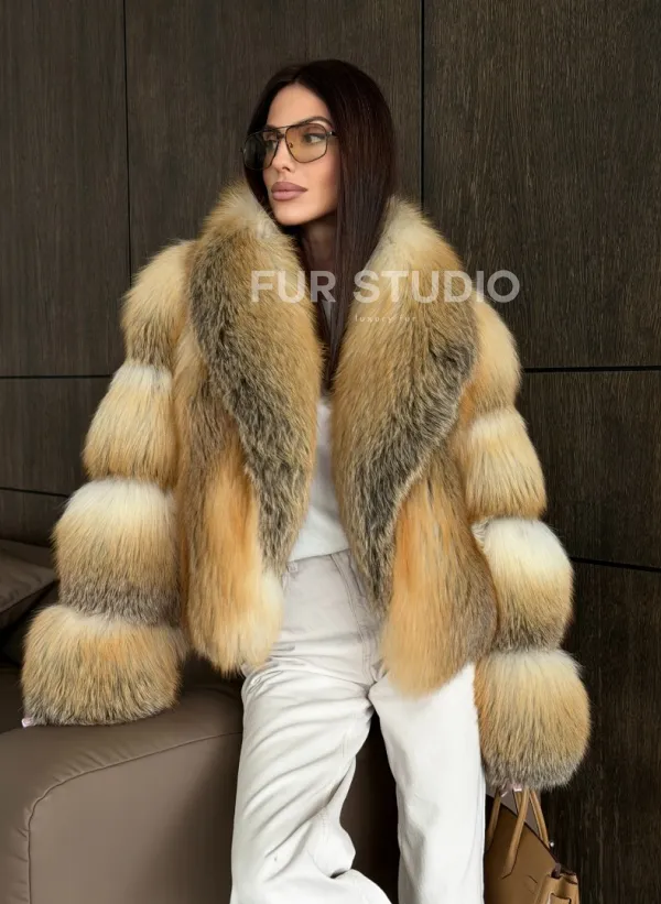 Мех данной шубы лиса, цвет рыжий. Предлагается в размерах от 42 до 50. Длина модели 50-55 см, что выгодно подчеркивает фигуру девушек. Эта модель идеально подойдет для девушек и женщин, предпочитающих роскошные натуральные меха.