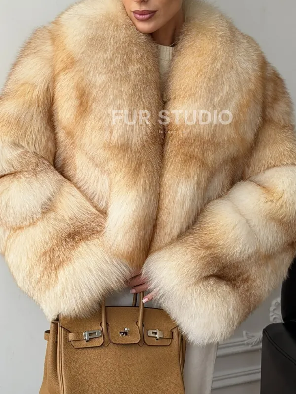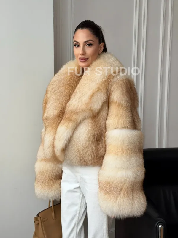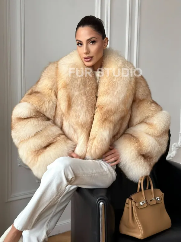 Полушубок-кроп с шалевым воротником из меха песца 102723