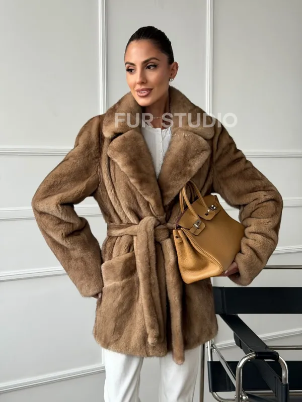 Полушубок норковый пастель с меховым поясом 102664