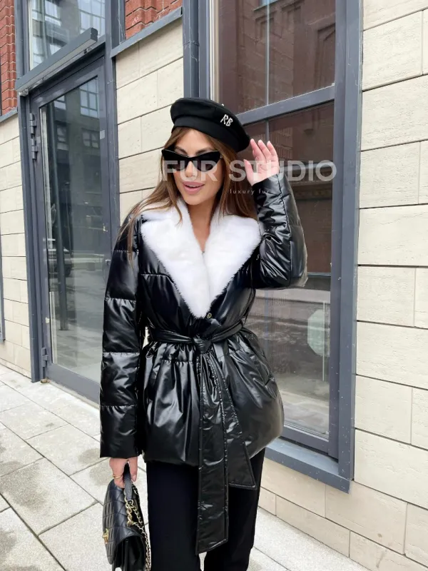 Пуховик с мехом белой норки в черном цвете 100402
