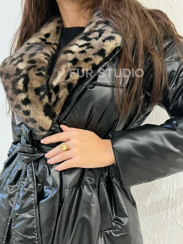 Пуховик с мехом норки в анималистическом принте 100391