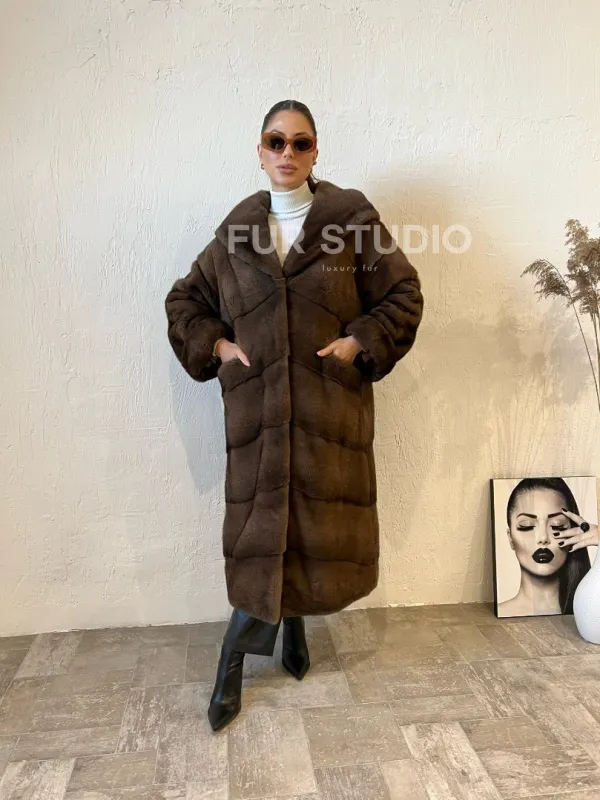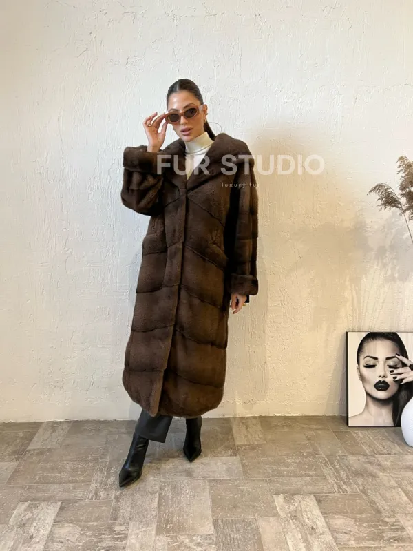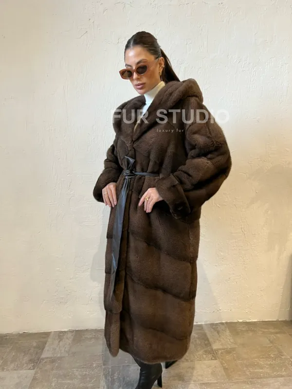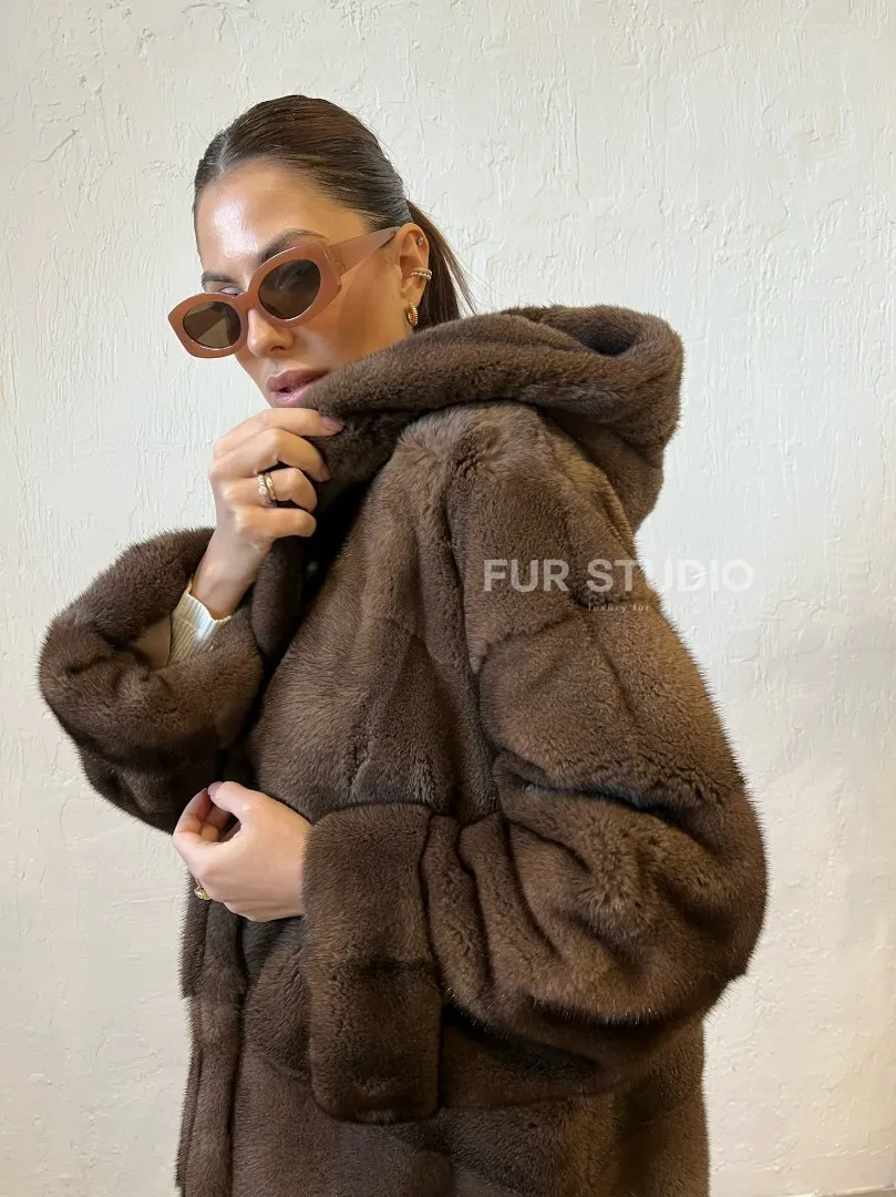 Шуба из меха норки с капюшоном - цвет соболь 100142