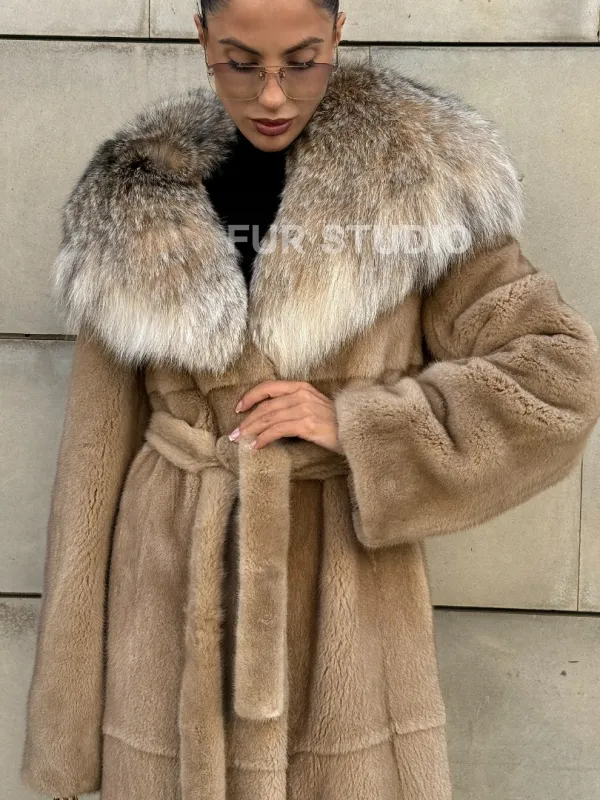 Шуба из норки Caramel с капюшоном из меха рыси 101057