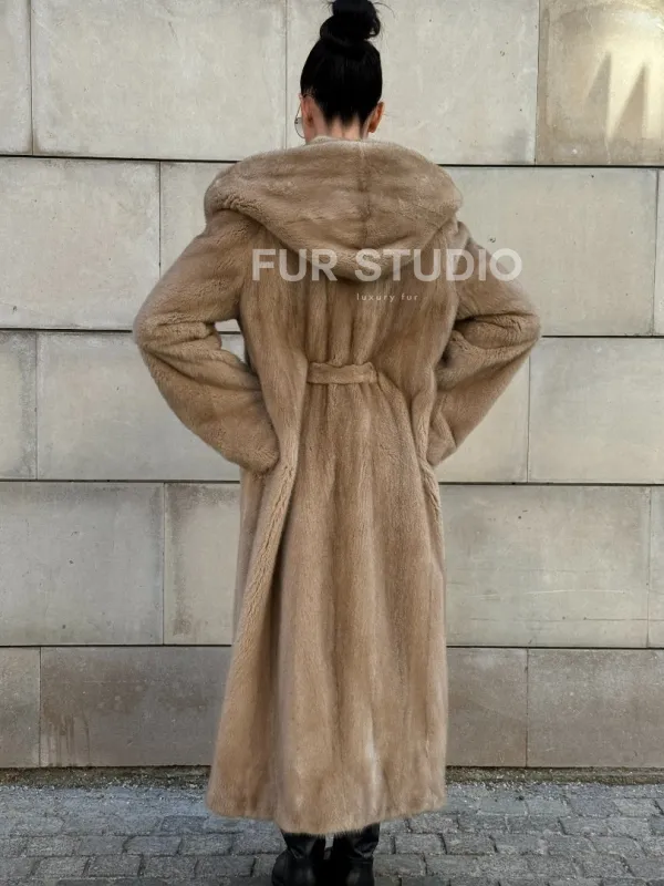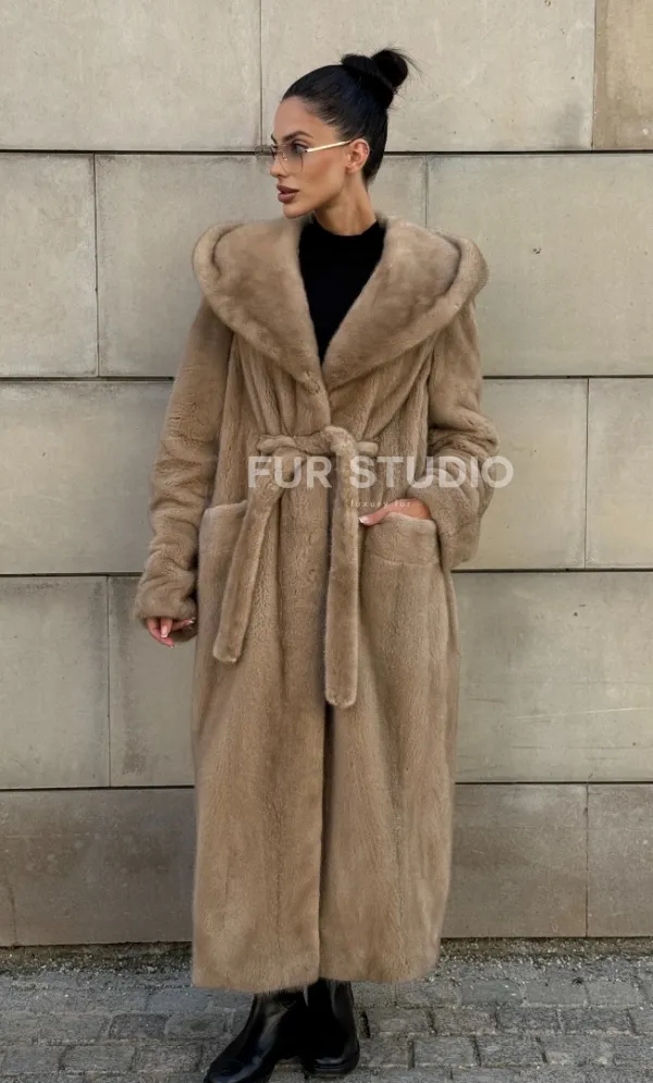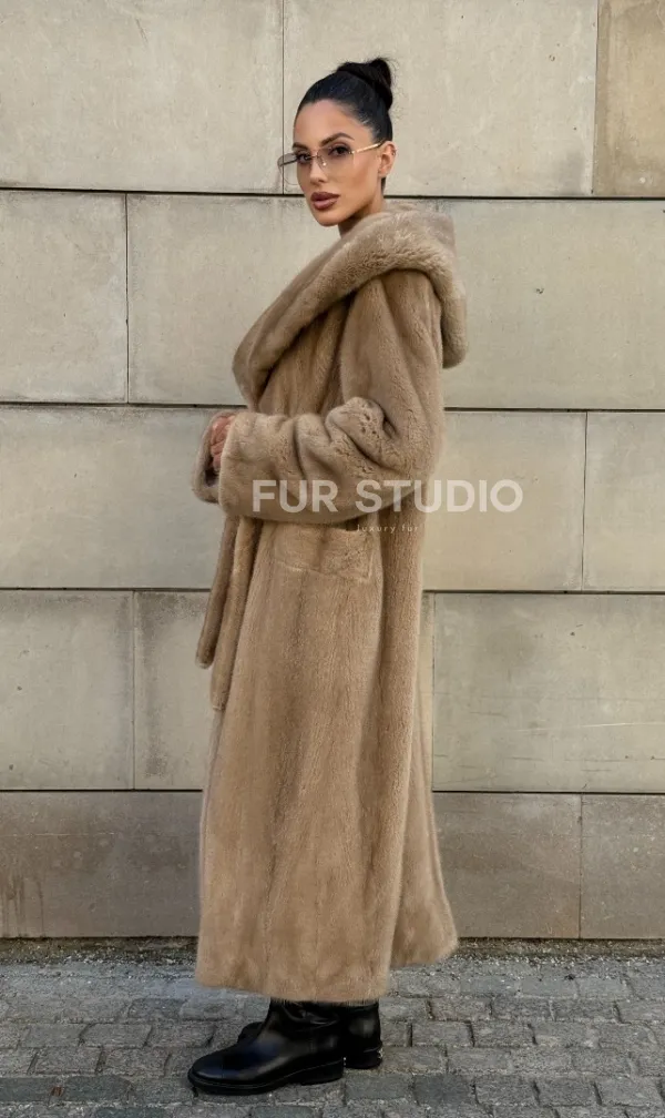 Шуба из скандинавской норки с капюшоном, цельный мех 101066