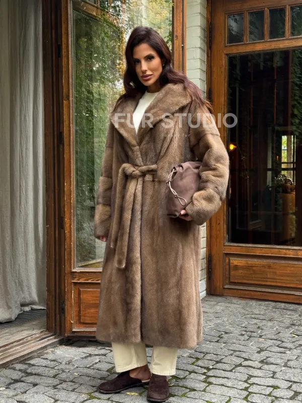 Мех данной шубы аукционная норка, цвет бежевый. Предлагается в размерах от 42 до 54. Длина модели 115-120 см, что выгодно подчеркивает фигуру девушек. Эта модель идеально подойдет для девушек и женщин, предпочитающих роскошные натуральные меха.