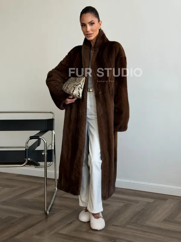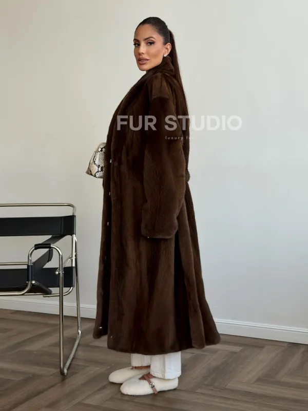 Мех данной шубы аукционная норка , цвет коричневый. Предлагается в размерах от 42 до 50. Длина модели 115-120 см, что выгодно подчеркивает фигуру девушек. Эта модель идеально подойдет для девушек и женщин, предпочитающих роскошные натуральные меха.